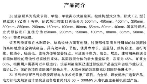 ZJ型渣漿泵是單級單吸、軸向吸入懸臂臥式離心泵,可廣泛用于冶金、礦山、電力、煤礦、水利、化工、輕工、石油等部門輸送含有大量固體物料的磨蝕性或腐蝕性漿體。